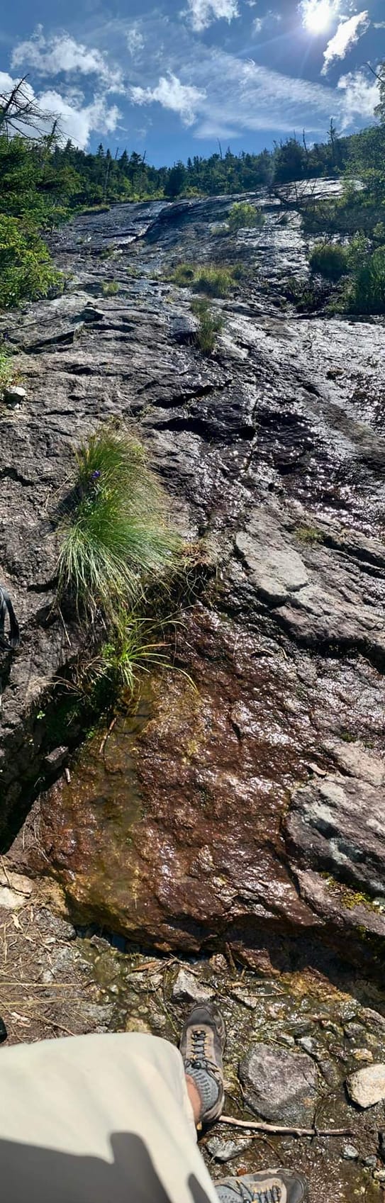 On the “red slime”. It is there. It is slick. It wasn’t much of a problem on the way up. The way down though…but that’s for later. You keep going up sections of slab followed with trail sections till you hit THE slab: